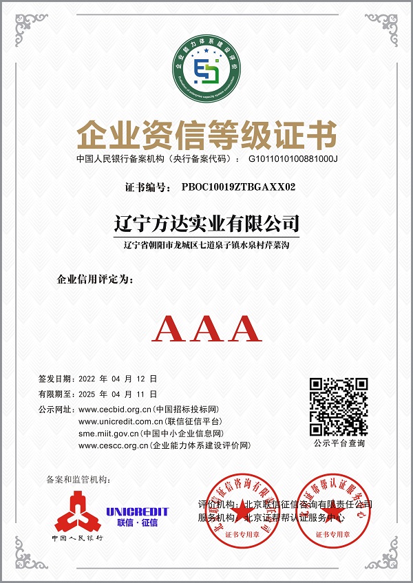 企业资信等级证书-荣誉资质-辽宁方达实业有限公司,辽宁朝阳方达铸钢厂,碳钢铸件,锰钢铸件,破碎机类,磨机类,窑类等铸钢配件